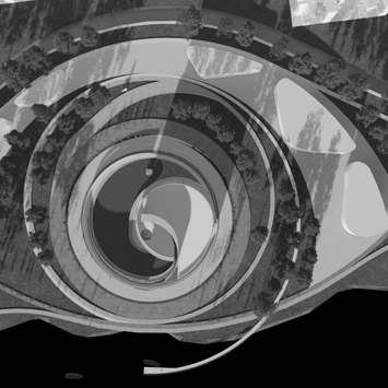 受到东方太极阴阳相生的启发,我们设想了一个带有神秘主义色彩的抽象的建筑体,在它将建筑与水景景观 融合的同时也对其所在的场地环境产生某种精神层面的回应,它似乎充满了柔美滋润的气质与天地发生了对 话,水中月,天中月,身处建筑空间之中一时间已分不清哪个月更亮,哪个月更圆,天边水镜的气氛中诗意 的体会月有阴晴圆缺,感悟生命的大美。
